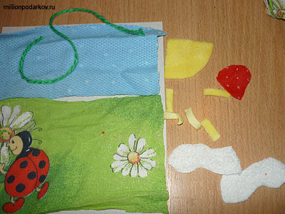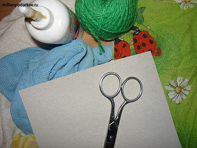 Для того, чтобы у нас получилась аппликация из ткани подберите лоскутки нужных цветов. У меня лоскутки были голубого, желтого, белого и зеленого цвета, на лоскутке зеленого цвета было изображение божьей коровки и цветочков. Еще нам потребуются нитки для вязания зеленого цвета, ножницы, клей ПВА, картон.