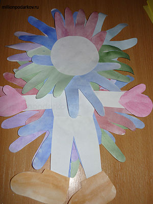 Вырезаем из бумаги силуэт рук ног и лица. Приклеиваем их к нашей основе.