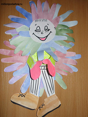 Положите на лист бумаги ладошку ребенка и обведите её карандашом. Сделайте 10-15 таких ладошек. Вырежьте их из бумаги. После этого нарисуйте ботиночки и ручки-варежки. Их так же вырежьте из бумаги. Раскрасьте ладошки и ботинки с ручками в любые цвета.