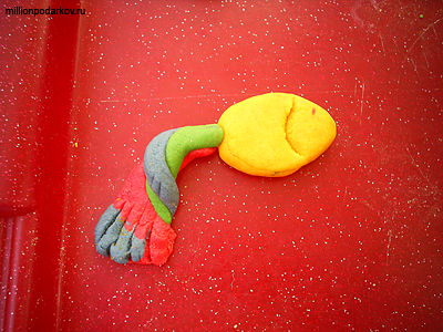 Лепим туловище и хвостик рыбки. Хвостик делаем из трех разноцветных колбасок, скрученных по спирали.