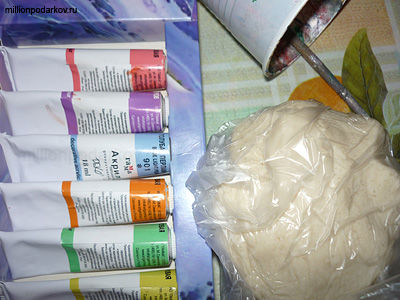 Для того, чтобы у нас получились бесплатные поделки из теста "Свин" приготовьте соленое тесто в домашних условиях смешайте муку и соль мелкого помола, добавьте немного воды и поставьте в холодильник на пару часов. Еще вам потребуются акриловые краски или гуашь, кисточка и стакан с водой.