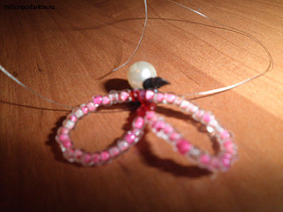 Его можно закрепить на одном из крыльев бабочки. Сделаем на одном из красных. Закрепим крылья с помощью бисера