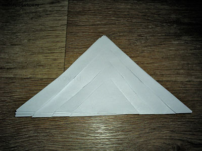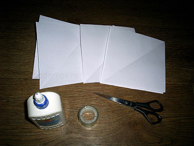 Каждый квадрат складываем по диагонали. Разрезаем их так, как показано на рисунке. Чтобы ускорить процесс, квадратики можно сложить друг с другом и сделать прорези на всех вместе.