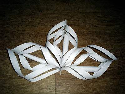 Делаем еще пять таких долек. Каждые три из них соединяем с помощью степлера или скотча. Получается половинка снежинки.