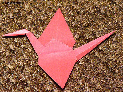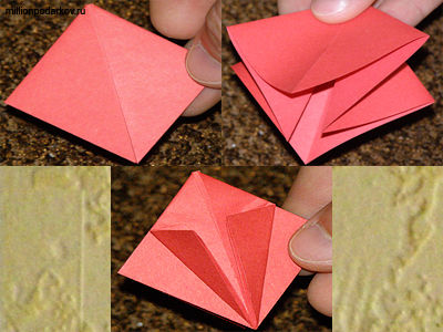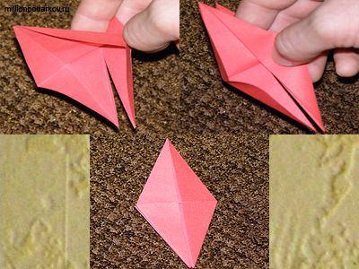 После того как мы согнули наши углы мы раскроим как на фото, затем верхние углы мы отогнём чтоб получить крылья, а два нижних слажим и раскроим для получения хвостика и головы нашей фигуры.