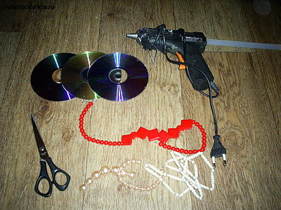 Для изготовления поделки нам понадобится три испорченных диска, горячий силиконовый пистолет и острые ножницы. Кроме этого можете подготовить бусины для украшения поделки.