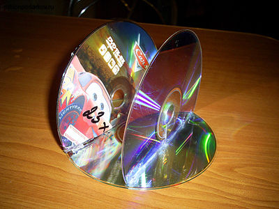 Отрезаем от двух дисков небольшие фрагменты и приклеиваем оставшиеся части к третьему целому диску. Теперь сделаем из отрезанных кусочков «боковушки» нашей подставки и приклеим их.