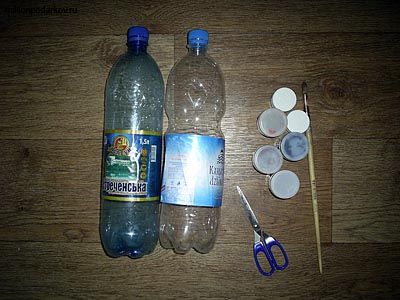 Для изготовления дачного украшения из бутылок, подготовьте пластиковые бутылки, ножницы и краски.