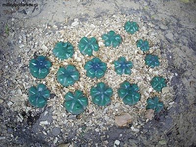 Покрасьте их эмалевыми либо любыми другими красками для внешних работ. Теперь вкопайте донышки в землю, создавая нужную композицию. Вокруг пластиковых «цветочков» можно насыпать деревянную стружку, тогда украшение будет выглядеть более выразительно.