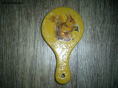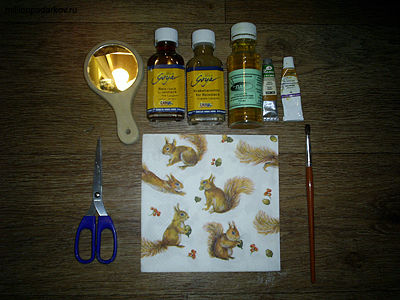 Итак, для создания нашей декупаж поделки мы использовали зеркальце в деревянной оправе, трехслойную салфетка с рисунком, двухфазный лак для создания кракелюр, лак акриловый, акриловые краски, кисточку, ножницы. В качестве лака для кракелюр мы применяли "Goya" от фирмы C.KREUL.