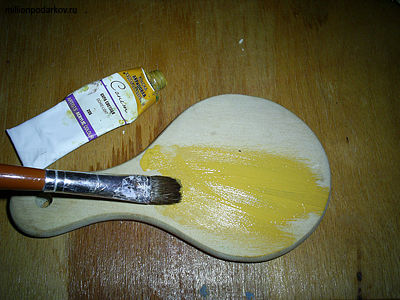 Для начала красим зеркальце акриловой краской выбранного цвета. В нашем случае это будет темно-желтый цвет.
