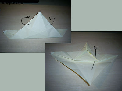 Верх сторон треугольника складываем к центру, одновременно с этим расправляя углы. Руководствуясь второй фотографией, выполняем складку вверх и загибаем внутрь углы..