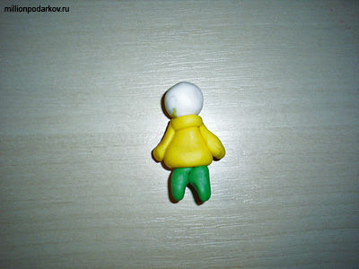 Из белой пластики лепим голову человечка, из желтой – туловище и руки, а из зеленой – ноги.