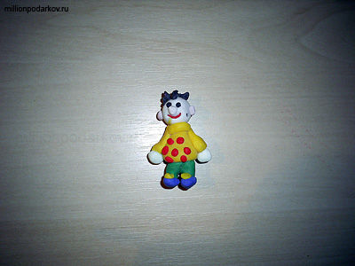 Теперь из пластика белого цвета делаем уши и нос. Из черной пластичной массы лепим глаза и волосы, а из красной рот. Сделаем синие башмачки с желтыми помпонами. На туловище выполним декор из красной пластики.