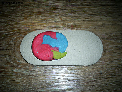 Берем по кусочку теста каждого цвета и смешиваем их вместе. Из картона вырезаем овал.
