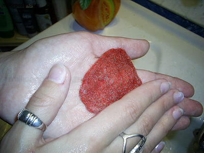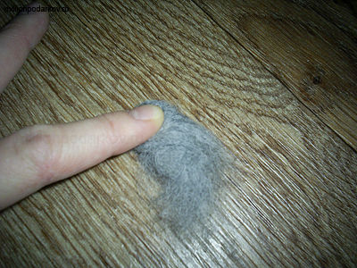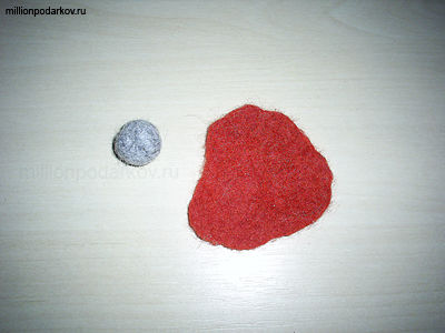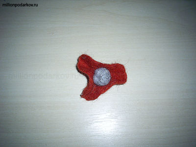 Теперь берем кусочек красной шерсти, делаем из нее плоскую деталь, опускаем в мыльный раствор и трем между ладонями, сваливая шерсть.