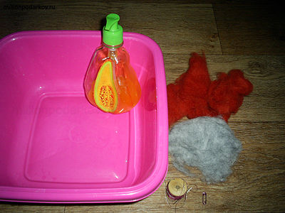 Для того чтобы делать детские к 8 марта приготовьте такие материалы, как шерсть кардочесанная красного и серого цвета, пластиковый тазик, жидкое мыло, нитки, иголку, английскую булавку.