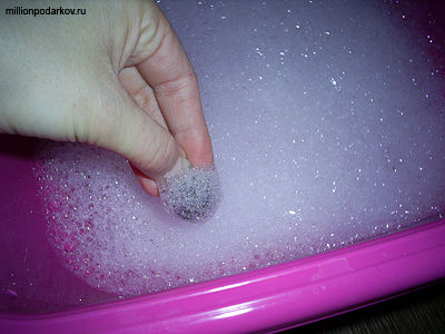 Наливаем в тазик горячую воду и разбавляем в ней жидкое мыло. Теперь берем наш шерстяной шарик и опускаем его в мыльный раствор. Начинаем катать шарик между ладонями. Сначала делаем это легко, и постепенно, как шерсть начнет сваливаться, сдавливаем его ладонями все сильнее.