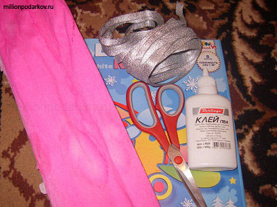Для изготовления детской поделки к Дню Святого Валентина нам понадобится гофрированная бумага, картон, ножницы, лента и клей. Клей лучше брать ПВА.