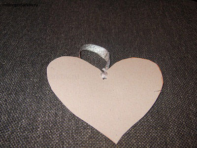 Для основы возьмем белый картон. На нем рисуем сердце и вырезаем. Делаем отверстие в сердце и вставляем туда ленточку, делаем петельку, на которой сердце будет висеть.
