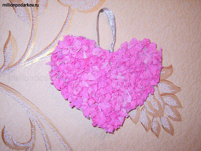 Следующий этап изготовления детской поделки к Дню Святого Валентина – нарезка квадратиков из гофробумаги. Сердце мажем клеем, сминаем приготовленные квадраты бумаги и приклеиваем их к сердцу. Когда вся поверхность сердца будет заклеена бумагой, поделка будет готова.