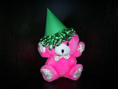 Наш чудесный праздничный колпак подошел вот такому игрушечному мишке, но такое украшение можно вполне сделать и ребенку, и взрослому. Для этого берите картон большего размера. Рассчитывайте так, чтобы диаметр круга была равен окружности головы.