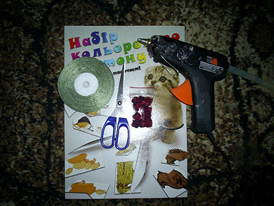 Для изготовления поделки приготовьте атласную ленту зеленого цвета, картон, силиконовый пистолет и ножницы.
