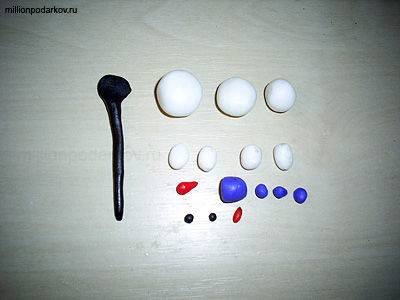 Делаем из пластики детали нашего будущего снеговика. Итак, из белого материала скатаем три шарика разных размеров и немного сплющиваем их. Сделаем еще четыре овальные маленькие детали, которые станут руками и ногами снеговика. Из синей пластики сделаем шапку и пуговички, а из черной – заготовку для метлы и глазки. Нам также понадобится ротик и носик-морковка красного цвета.