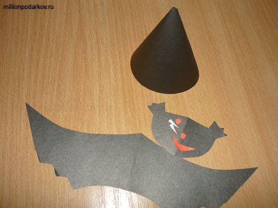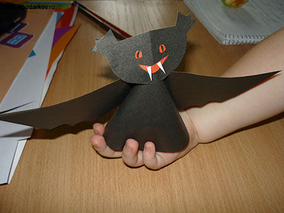 Склеиваем из бумаги черного цвета конус. Затем вырезаем мордочку и крылья. Из красной бумаги вырезаем глаза и рот, а из белой - клыки.