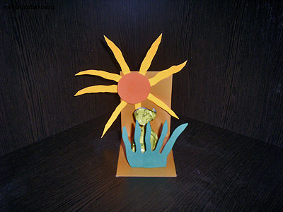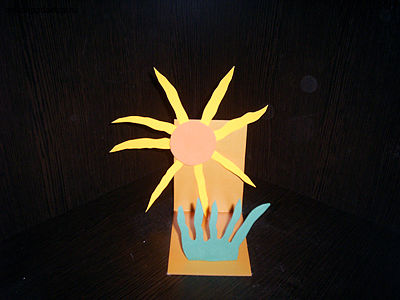 Из цветного картона вырезаем длинный прямоугольник и складываем его пополам. Декорируем флексикой и цветной бумагой, сделав солнышко и травку.