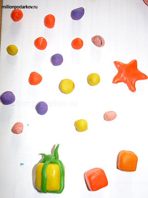 Лепим из пластилина подарки, маленькие шарики и звездочку