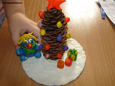 Детские поделки из пластилина и шишек "Новогодняя композиция"