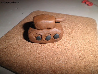 Из коричневого пластилина лепим отдельно все составляющие танка, а потом собираем. С помощью черных маленьких кружочков и степа делаем колеса.