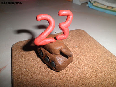 Устанавливаем цифры на вылепленный танк. Детские поделки из пластилина к 23 февраля отличаются своей тематической направленностью и стилем.