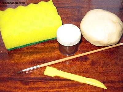 Нам надо замесить соленое тесто из воды, соли и муки. Также приготовим гуашь коричневого цвета, кисточку, губку для мытья посуды и стеки для работы с тестом.