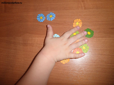 Вырезаем несколько цветочек желтого, зеленого, красного и синего цветов. Наклеиваем на них желтую серединку.