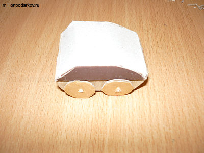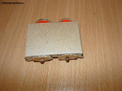 Вырезаем из картона колесики. Затем вставляем в коробок спички и одеваем колесики на них. У нас получилась нижняя часть броненосца.
