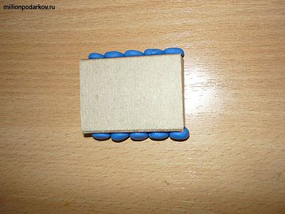 Катаем из пластилина маленькие шарики и приклеиваем их по бокам спичечного коробка - это будут гусеничные колеса.
