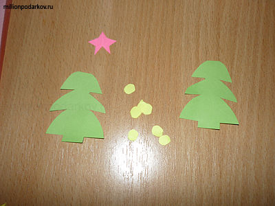 Вырежьте из цветной бумаги детали для поделки. Это будет ёлочка в 2 экземплярах, звезда и шарики-фонарики.