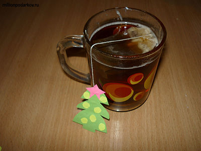 Обрезаем ярлычок от чайного пакетика. Наклеиваем ярлык на ёлочку.