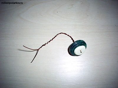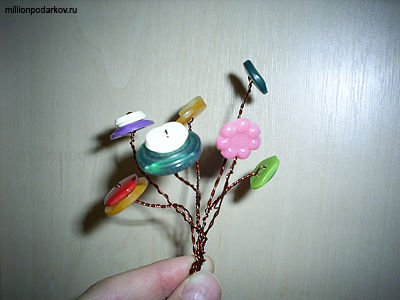 Делаем еще некоторое количество таких «цветочков». Также не забудьте и о «листочках». Для их изготовления вам понадобится лишь одна зеленая пуговица. Собираем все поделки вместе и переплетаем проволоку, делая букетик. Выступающие снизу проволочки подрезаем.