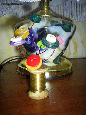 Теперь нам осталось придумать для пуговичного букета цветов вазочку. В этих целях можно воспользоваться катушкой ниток. Мы просто вставим в нее цветочки. Такие детские поделки развивают фантазию, мелкую моторику, внимательность малыша. К тому же результат получается очень симпатичным. Такие поделки можно дарить родителям, бабушкам и дедушкам.