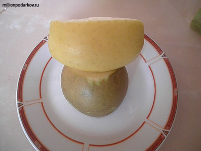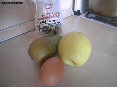 Чтобы сделать детскую поделку с овощами и фруктами нам понадобится груша и зеленое яблоко. Для глаз будем использовать перец горошком, а также сваренное яйцо