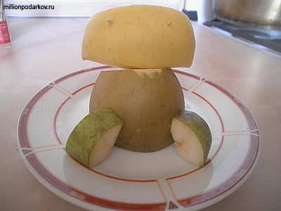 Для этого срезаем часть снизу для устойчивости, к остальной части груши с помощью зубочисток прикрепляем кусок яблока, который будет головой для лягушонка