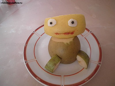 Детские поделки с овощами и фруктами поражают своей очаровательностью, поэтому нужно сделать лягушке глаза из небольшой части белка от яйца и двух перчинок.