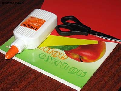 В работе мы будем использовать красную и желтую бумагу, готовую картинку яблока, клей ПВА и ножницы.