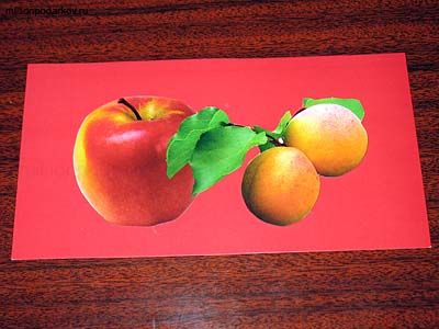 На основу наклеиваем наши фрукты, вырезанные из обложки тетради. Если вы не нашли готового изображения яблока, его можно просто вырезать из цветной бумаги.