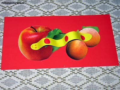 Из полосочки желтой бумаги вырезаем гусеничку нужной длинны, наклеиваем на спинку красные кружочки (мелкие детали детям давать уже готовые). Рисуем ей глаза и ротик. Сгибаем гусеницу, чтобы она два раза касалась основы и приклеиваем в месте касания.