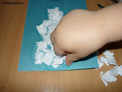 Наносим клей на контур снеговика. Затем аккуратно приклеиваем кусочки бумаги.