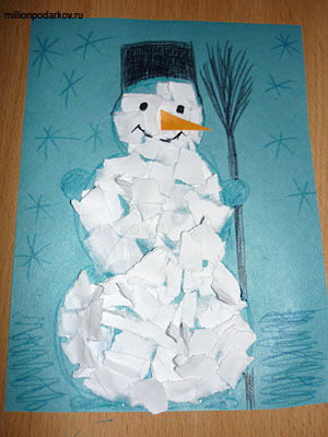 Когда клей высох оформляем снеговика, рисуем глазки, метлу и снежинки, приклеиваем морковку. Аппликация снеговик готова!